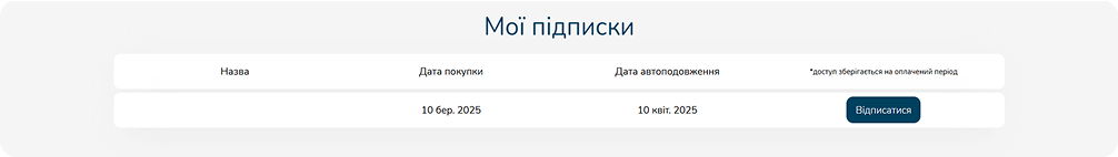 Підписка поновлюється автоматично в день завершення оплаченого періоду відповідно до обраного тарифу. Ви можете скасувати її в розділі "Мої підписки" в особистому кабінеті, натиснувши "Відписатися". Якщо кошти вже були зняті, вони не підлягають поверненню, але доступ до платформи зберігається до кінця оплаченого періоду.